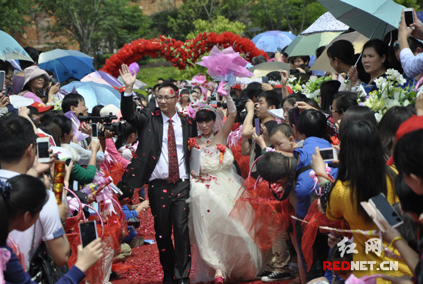 (5月12日,華菱漣鋼參與集體婚禮的新人們穿越愛的拱門,伴隨著愛的宣言,踏上通往婚姻殿堂的紅地毯。)