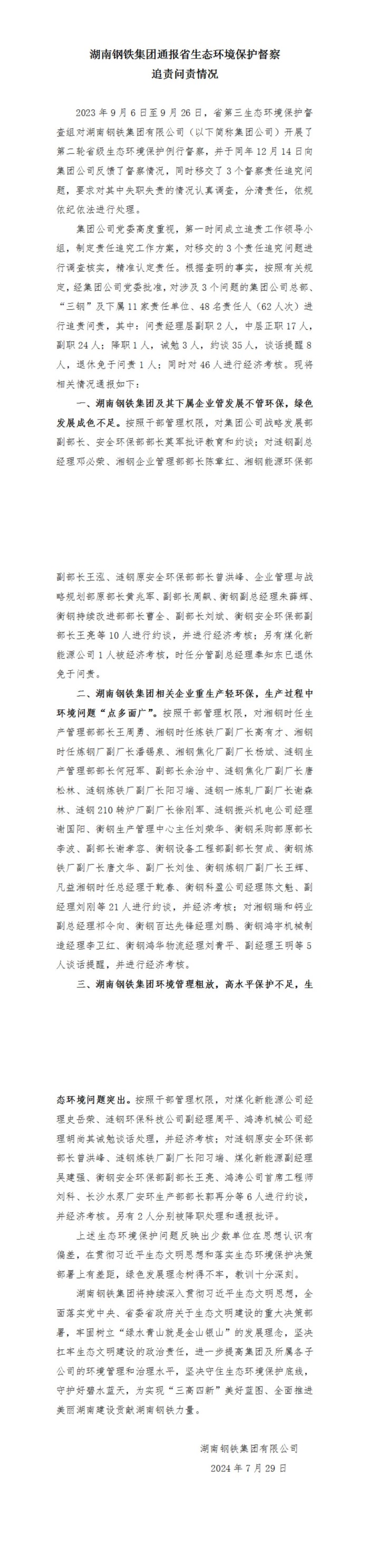湖南鋼鐵集團通報省生態(tài)環(huán)境保護督察追責問責情況